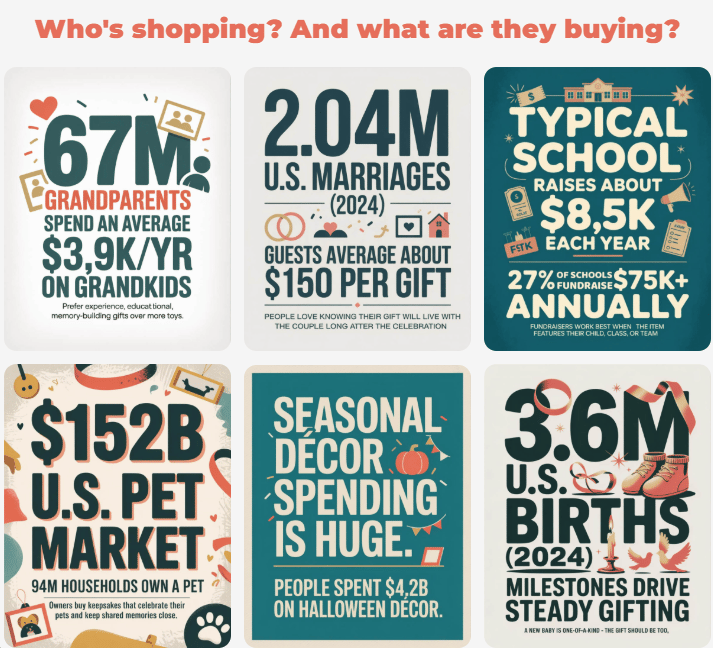 Each of these audiences spends big on personalized, emotional gifts – and now you can serve them instantly.