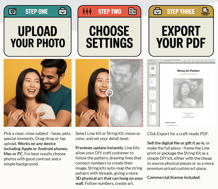 Step 3: Export & Sell Click export and download your complete PDF package with pattern, instructions, materials list, and mockup images. Ready to sell on Etsy, gift to loved ones, or create the art yourself.